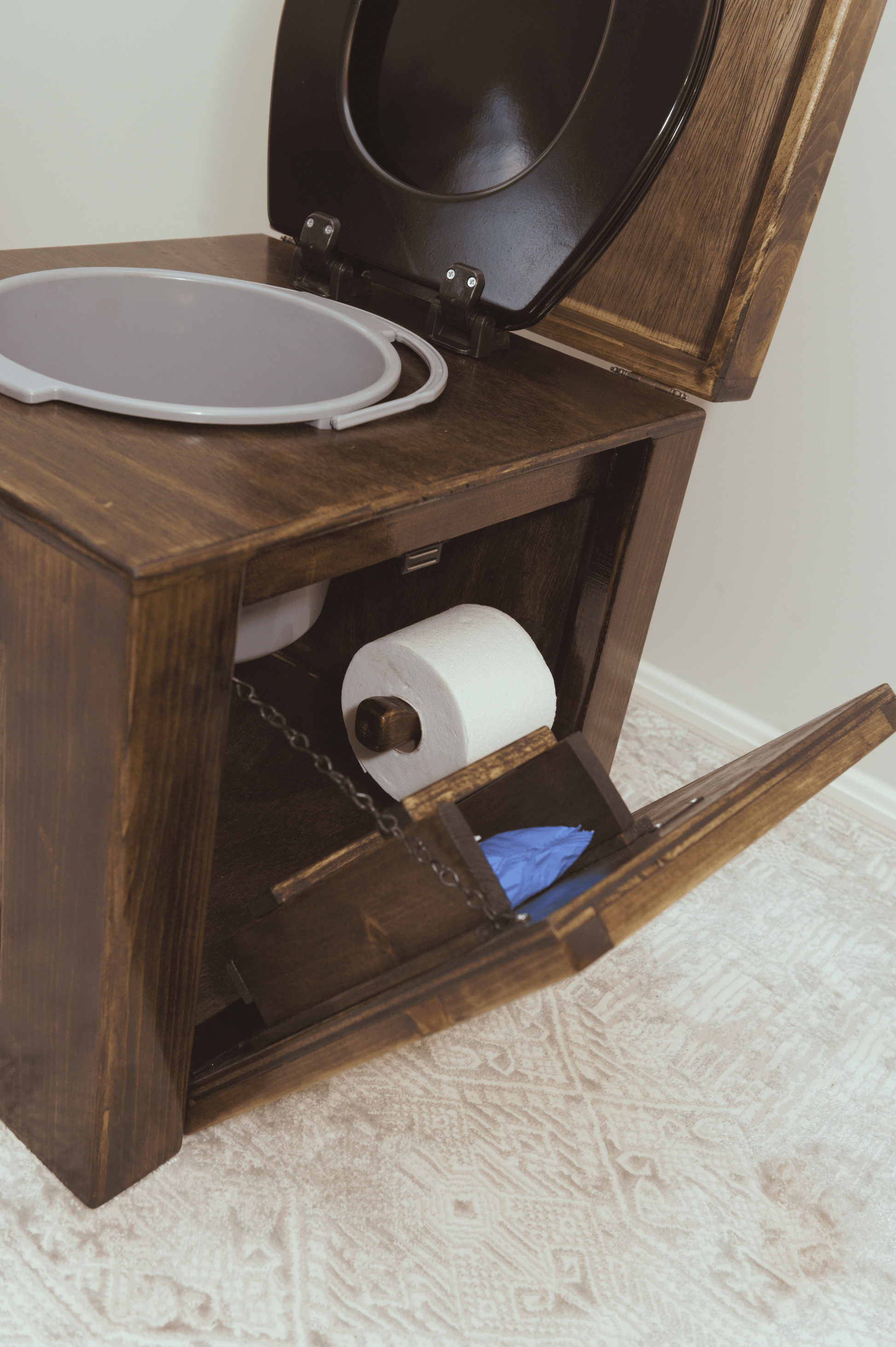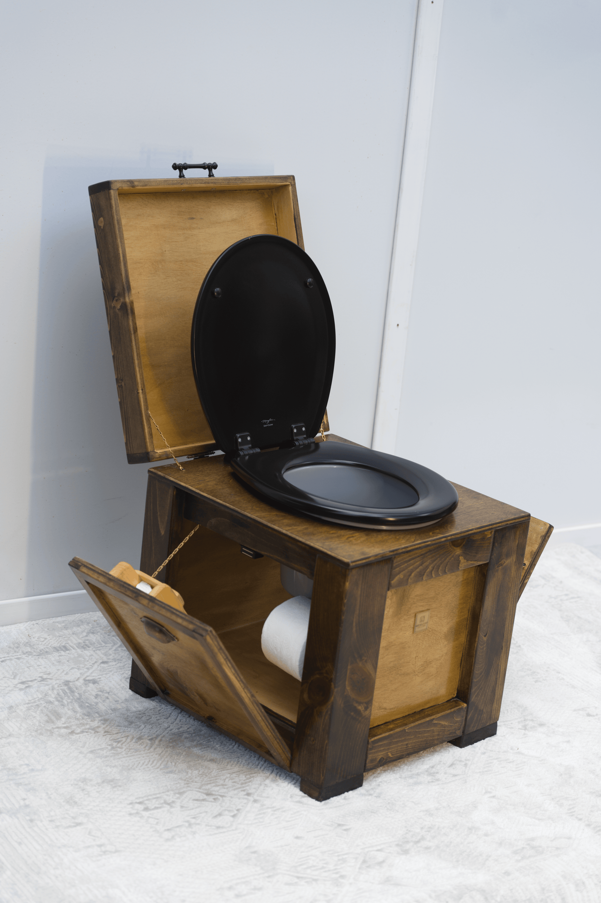 It’s a fully functional compost toilet disguised as a beautifully built piece, with clever side compartments that open from the top for quick access to toilet paper, wet wipes, and a built-in trash. The remainder of the space inside stores extra supplies, while the removable bucket lifts out easily for emptying.